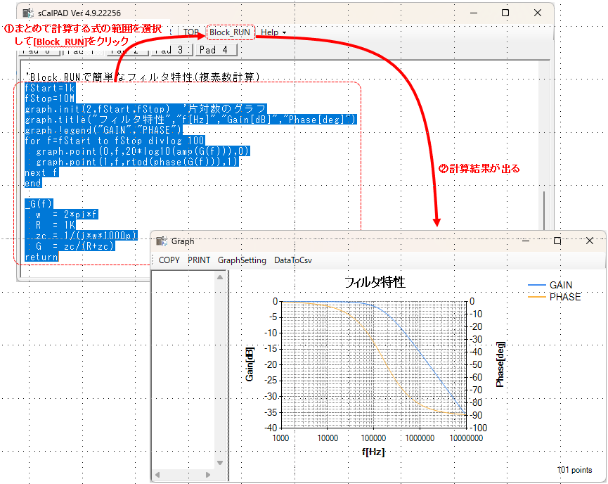 Ver4.9では以下のように複数行を選択して[BlockRUN]する事で一括実行出来、回路の周波数特性などの計算がしやすくなりました!